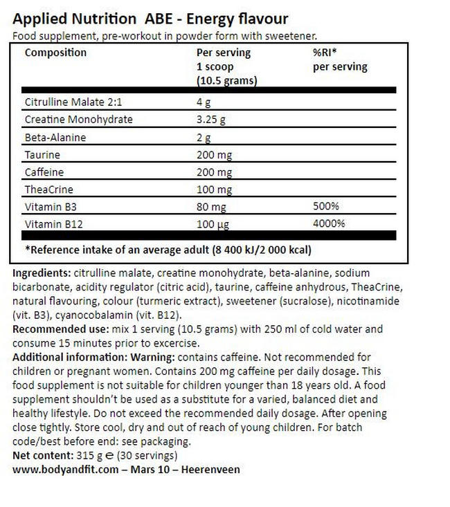 Applied Nutrition ABE KEY BENEFITS Creatine increases physical performance during high intensity exercise Niacin contributes to the reduction of tiredness. Read honest and unbiased product reviews from our users. This pre-workout also contains powdered vegetables containing antioxidants thus reducing the risk of post-workout.