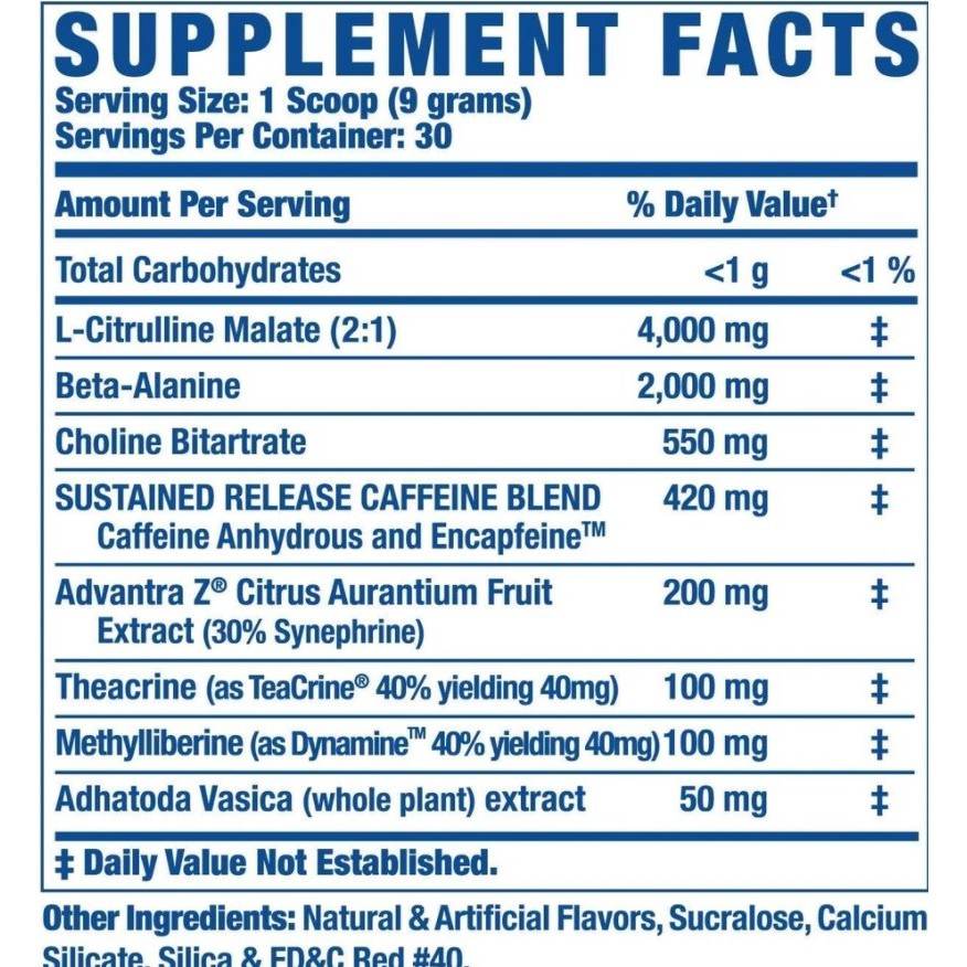We rounded this formula off with 4G of L-Citrulline 2G of Beta Alanine and 550mg of Choline Bitartrate. Only for those with a high stim tolerance this is seriously strong. Nutrition label Other Ingredients.